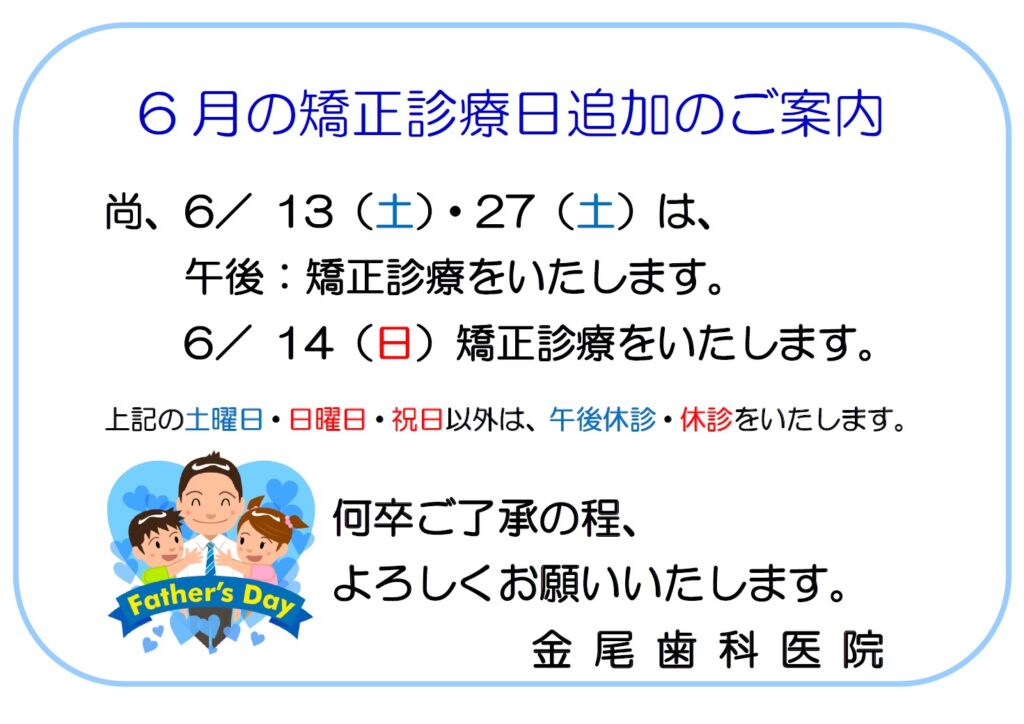 【6月の矯正診療日追加のお知らせ】